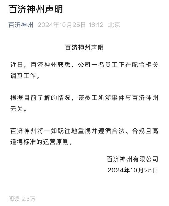 2024年10月25日,A股闭市之后,百济神州在官方微信公众号发布声明称,获悉公司一名员工正在配合相关调查,但据了解,该员工所涉事件与百济神州无关。百济神州将一如既往地重视并遵循合法、合规且高道德标准的运营原则。