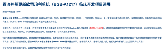 4月3日,百济神州在官网宣布停止TIGIT抗体Ociperlimab(欧司珀利单抗,BGB-A1217)作为肺癌潜在治疗方法的临床开发计划。